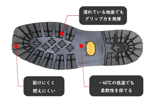 私達は全てのソールでビブラムソールを使用しております。ビブラムは多様な市場に進出し登山だけではなくワークブーツやスニーカーソール等、幅広いシーン、また多くの企業に使用されているソールメーカーです。機能性、耐久性、高度な性能、滑りにくく、完成したソールは10項目以上の測定が行われ、実際に使用する環境下でのフィールドテストで合格したソールのみが市場で販売されます。以上の理由からビブラムソールを使用しております。