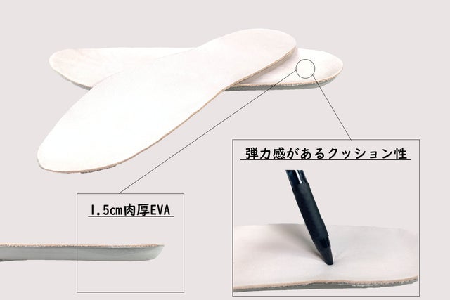 より快適に履いて頂く為に全デザインにカップインソールを使用しております。カップインソールがある事により、中敷きを清潔を保ち踵をサポ―トし、地面からの衝撃を緩和し痛みの軽減につながります。中敷には履き心地が柔らかく耐久性がある馬革を使用しております。また馬革には湿気、蒸れを軽減する為より快適に使用して頂けます。