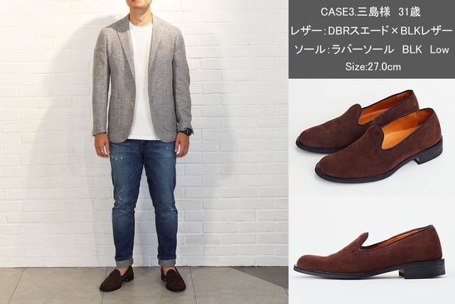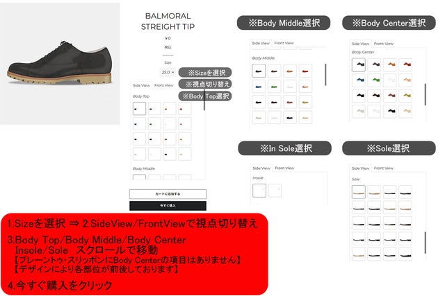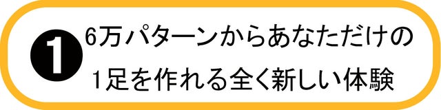 既存品では変更できなかった部分も変更可能になっており、デザインパターン、色、素材、ソールまで含めると6万通りから選べ、自由に組み合わせが出来ます。また流行や在庫切れにより気に入ったモデル、型が無く無くなってしまった、という事が無く、1度気に入って物であれば注文出来、再注文も可能になっております。