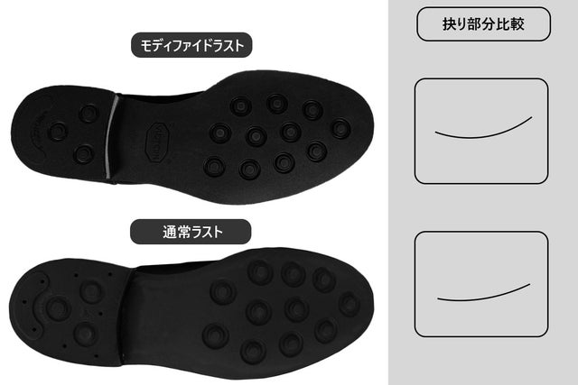 通常の木型に比べ、土踏まず部分を大きく抉る事により、土踏まずにフィットします。また土踏まずが持ち上がる事により甲部分にもフィット感が増し、土踏まずと甲で固定する事によりつま先に余裕がある為、快適に履いて頂けます。上記の木型は※₁高級靴にも取り入れらる木型で、日本人にも合う木型と言われております。
