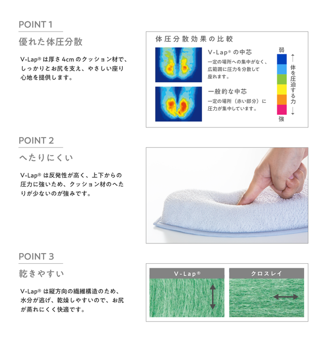 マシュマロのようなふっかふかの座り心地を実現すべく、最適な素材を追求した結果、巡り合ったのが、日本を代表する世界的な繊維メーカー、テイジンの高機能素材V-Lap®でした。 体圧分散性に優れ、長時間座ってもお尻が痛くならないだけでなく、へたりにくく、乾きやすいなど、あらゆる面で優れた素材特性を活かして、確かな品質を実現しています。