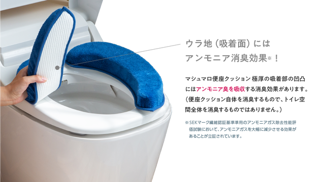 『マシュマロ便座クッション 極厚』の魅力は、やさしい座り心地だけではありません。トイレ特有のアンモニア臭を吸収したり、上品なカラーで彩ったりと、多彩なメリットで、ご自宅のトイレがリビングのような“くつろぎ空間”に早変わり。