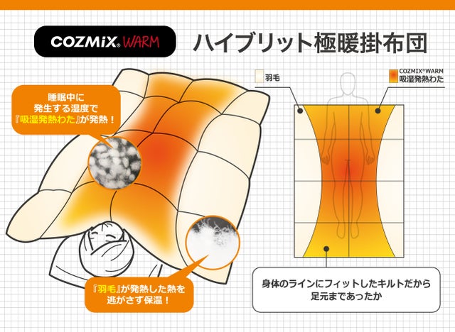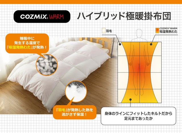 特殊キルトが身体にそったラインで『COZMIX®️WARM粒わた』が身体を温め、外側に配置された『羽毛』が温まった空気を逃がしにくく温かい!