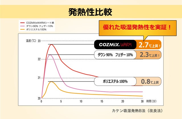 この公定水分率の話を踏まえて下のグラフ眺めて見ると、なんとCOZMIX®️ WARMは合成繊維なのに公定水分率が天然繊維のコットンと比べても非常に高いんです!!