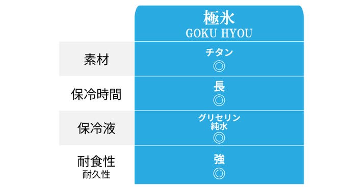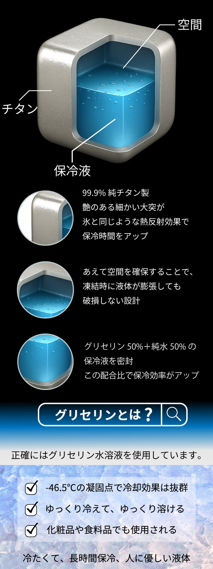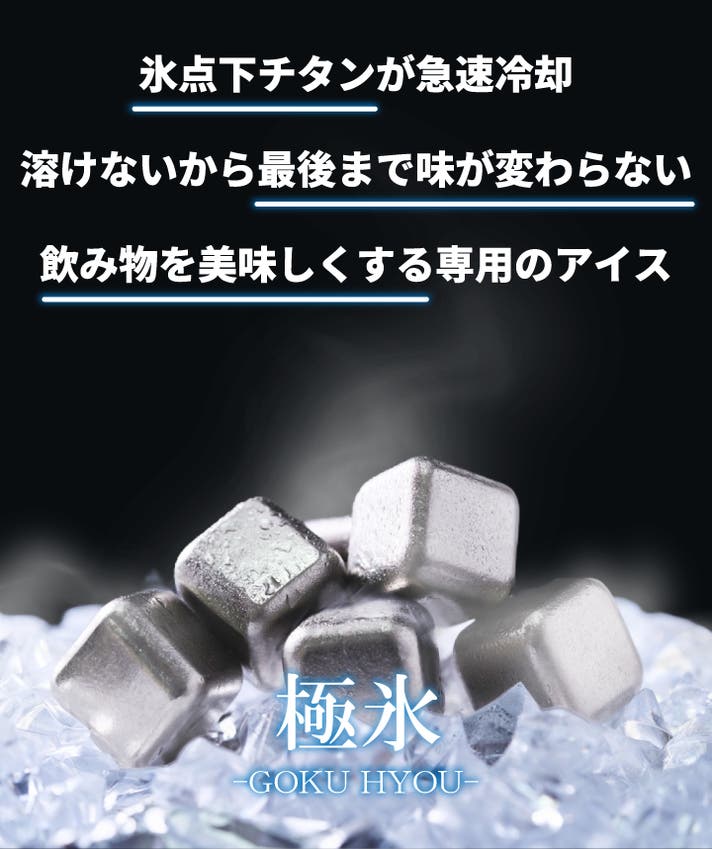 チタン素材を使用したアイスキューブは既にありますが、極氷はさらにサイズを大きくするとともに表面加工に変化を加えました。 サイズを大きくする事と表面をあえて凹凸のある平打ち加工にする事で保冷・冷却効果を高めています。