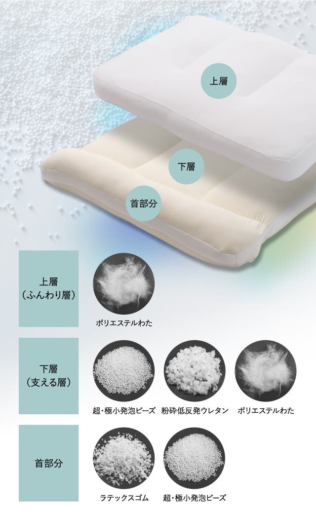 一般的な枕は「ビーズだけ」「低反発ウレタンだけ」など、素材が単一なことも多い中、極上Floatは部位に応じて機能を持たせるため、4種類の中材をバランスよく使い分けています。