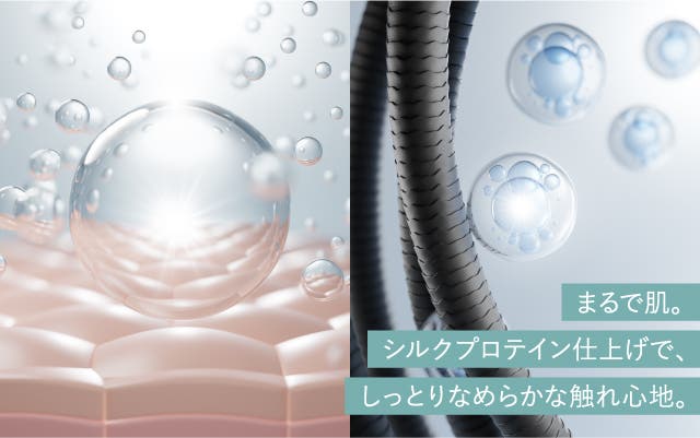 シルクタンパクは、肌に近い天然由来を豊富に含み、肌に触れるたびに優しく包み込みます。