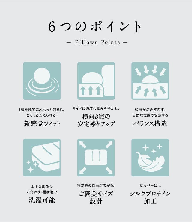6つのこだわりが、“包まれ・支え・整える”を叶え、極上な睡眠環境をつくります。