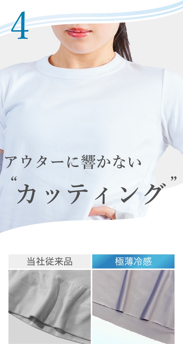 薄着の季節に気になる「下着のライン」が響きにくい切りっぱなしのカッティング製法を採用。ネックライン、袖口、裾のラインも気にせず安心して過ごしていただけます。