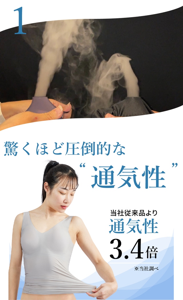 - 通気性3.4倍!伸縮性とシームレス加工で「まるで着ていないような感覚」を目指しました