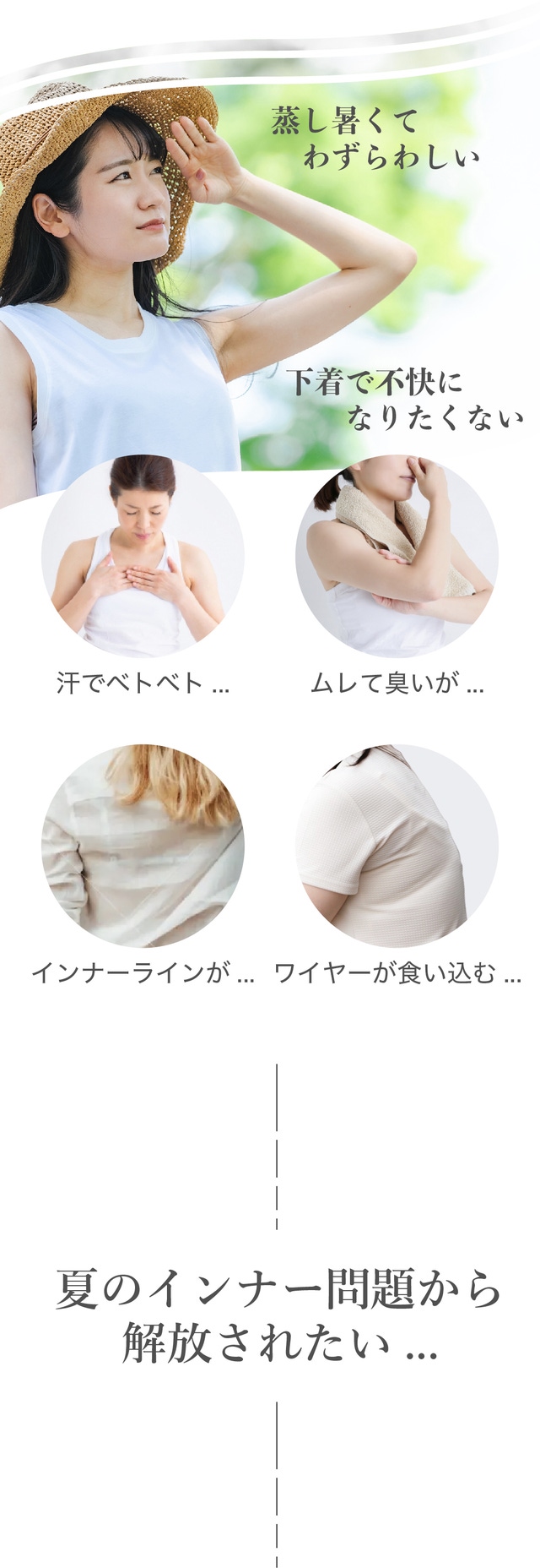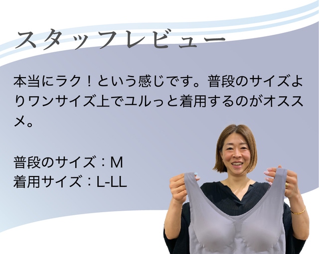 窮屈さや痛みの原因となるワイヤーをなくし、伸縮性がよい生地を採用することによってバストを暑さと締め付けから解放しました。気になるバスト部分は柔らかくふわふわのパッドが優しくサポート。