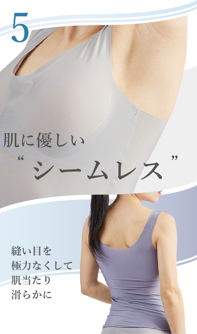 縫い目を極力減らし、生地同士を圧着させるシームレス加工を採用。タグもなくし肌当たりを滑らかにすることで着用中の快適さを追求しました。