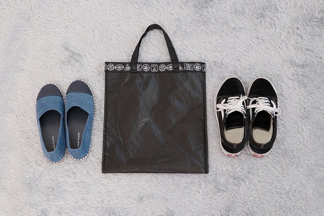このエコバッグはサイズが32*36cmで、シューズを2足入るようになっており、ホックがつけて、中身が零れることを予防してくれます。