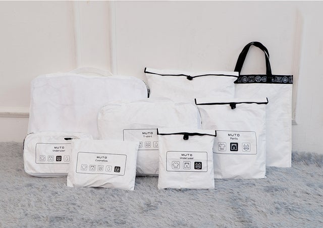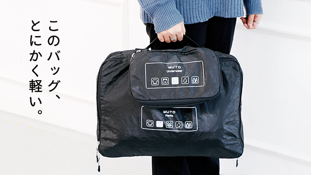 今回ご紹介したいのは、荷物を片付けるのが苦手な方にオススメしたい環境にやさしいタイベックトラベルバッグセット「MUTO」です。これさえあれば、スーツケースの中をキレイに整理できます。中身の荷物も一目で確認でき、着替えや洗濯物も分け入れることができ、サッと物を取り出すことができます。