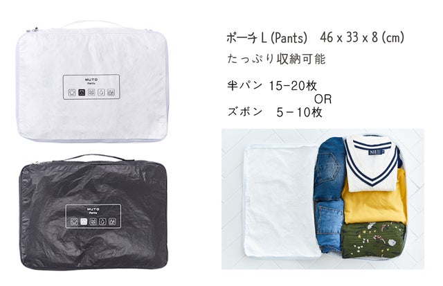 トラベルポーチL(Pants)、トラベルポーチM(T-シャツ)、トラベルポーチ S(Under Wear)は日帰り旅行及び出張時でも、必要な分だけもっていけます。