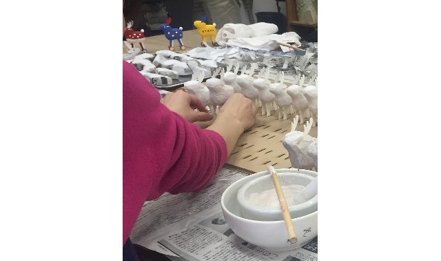 動物などの形を粘土/木型/新聞紙などで型つくり、それに紙を重ねてはり、糊(のり)がかわいてから、型を抜きとったもの。 中が空洞になっているので、見かけと違って軽いのが特徴。