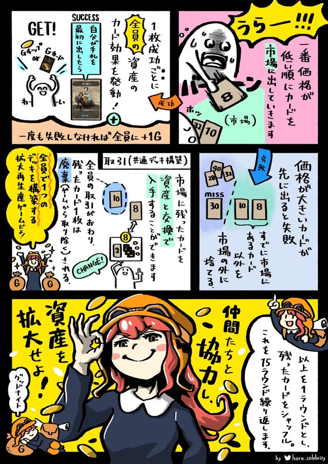 商人のように値付けをしよう。お互いの空気を読む意思疎通のコミュニケーションが大事。誰が先にカードを出せば儲けが大きくなる?徐々に大きくなる儲けにドキドキできる。