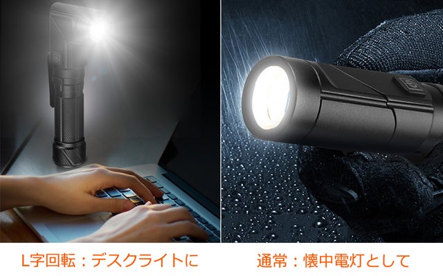 90°回転するヘッドライトが、懐中電灯をデスクライトに返信