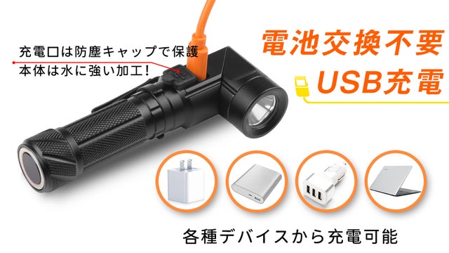 また、強力マルチ懐中電灯はUSB充電に対応。各種USB充電はもちろん、ノートPC・シガーライター等からUSB経由で給電可能です。約2時間でフル充電可能、電池切れの心配が少なく安心して利用できます。