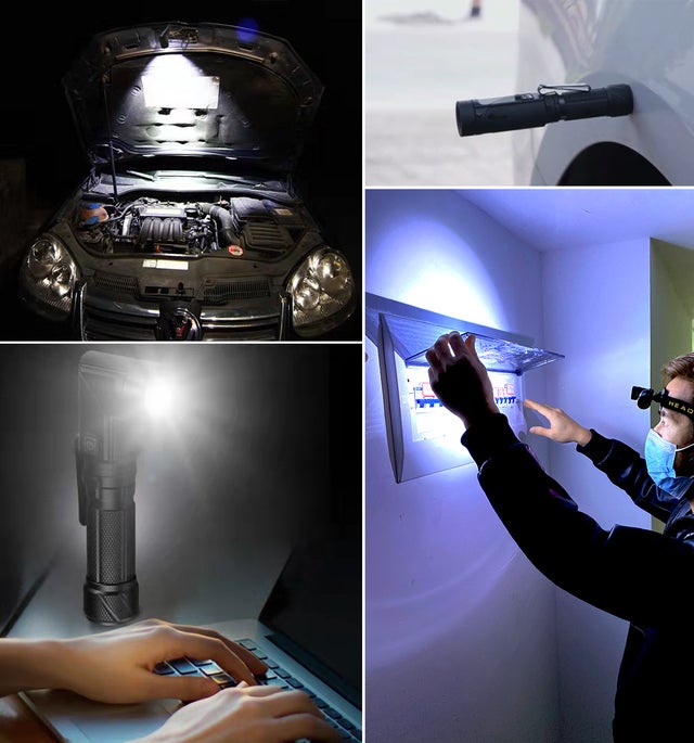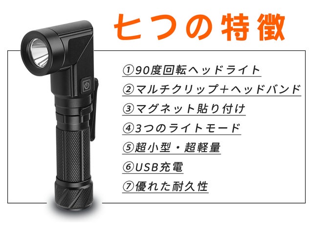ヘッドが90°回転するので、床に置けば横型を照らす作業ライトとして使用可能、底部の強力マグネットを車体やキャンプ用品等の金属面に貼り付ければ簡易的な固定照明として使えます。本体のマルチクリップをカバンや衣服に固定するか、付属のヘッドバンドを使用すれば夜間ハイキングでもハンズフリーでストレスなくアクティビティを楽しめます。