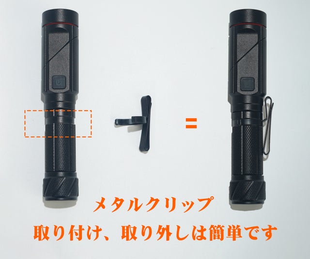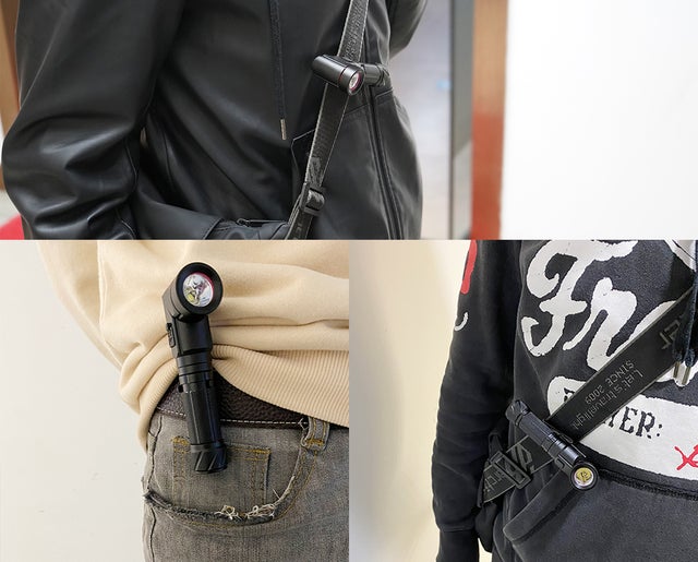 懐中電灯のボディにはマルチクリップが付属しています。ベルトや衣服のポケット、バックパックなどにクリップを挟んでライトを固定できます。ヘッドライトを90度倒して前方を照らせば、両手が使えて快適な歩行やアクティビティをサポートします。