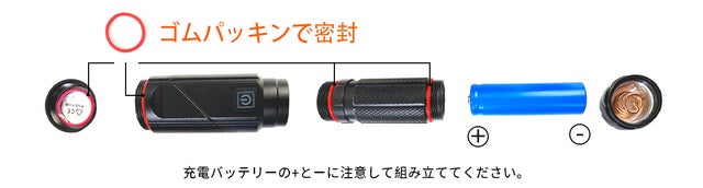 充電バッテリーのジョイント部分は特殊加工されており、ゴムパッキンで密封されます。(※USB充電口のプラグは防水防塵加工されたキャップで保護されています)