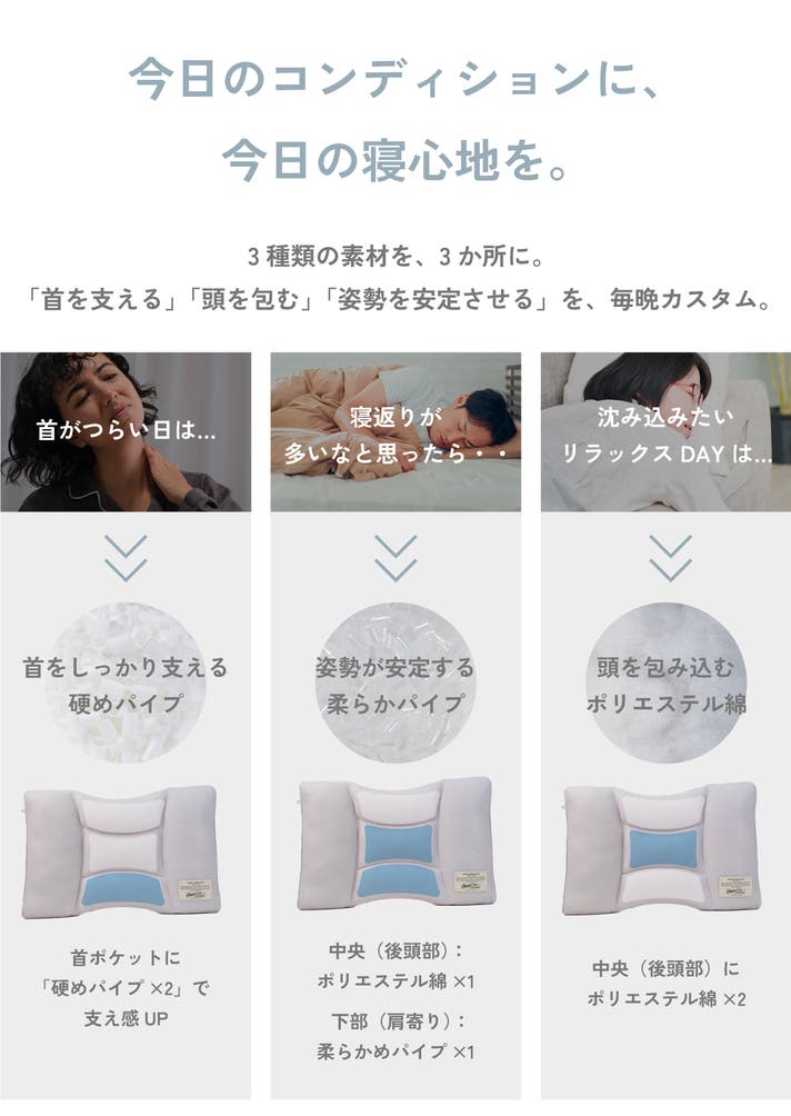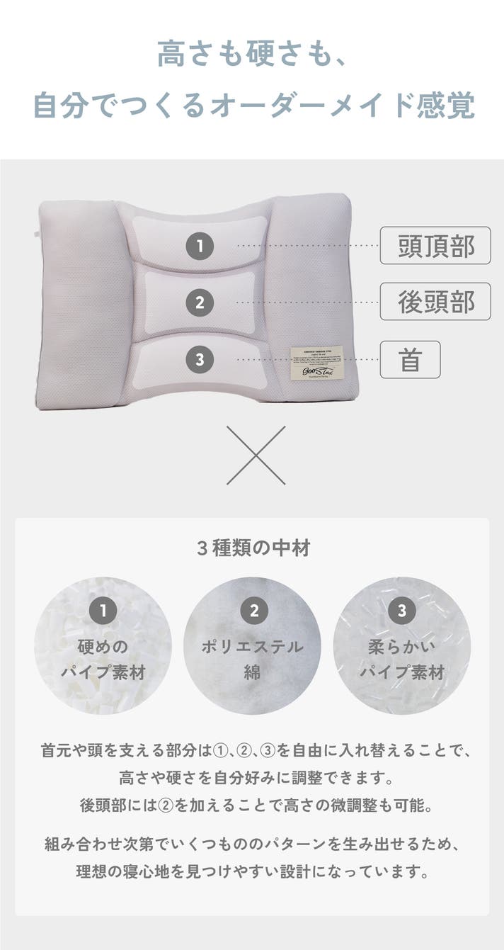 - 【圧倒的な調整自由度】中材を出し入れするだけで、高さ、硬さ、フィット感まで細かく調整