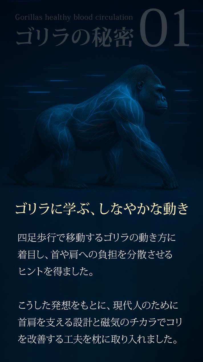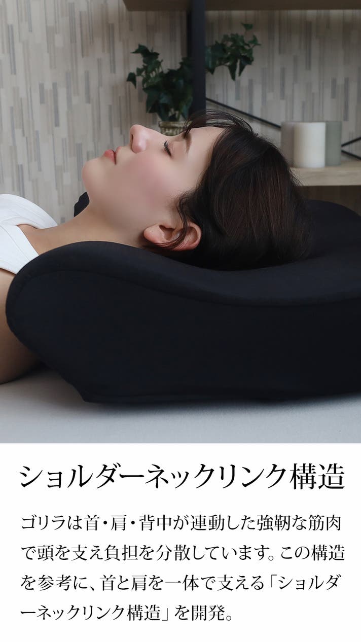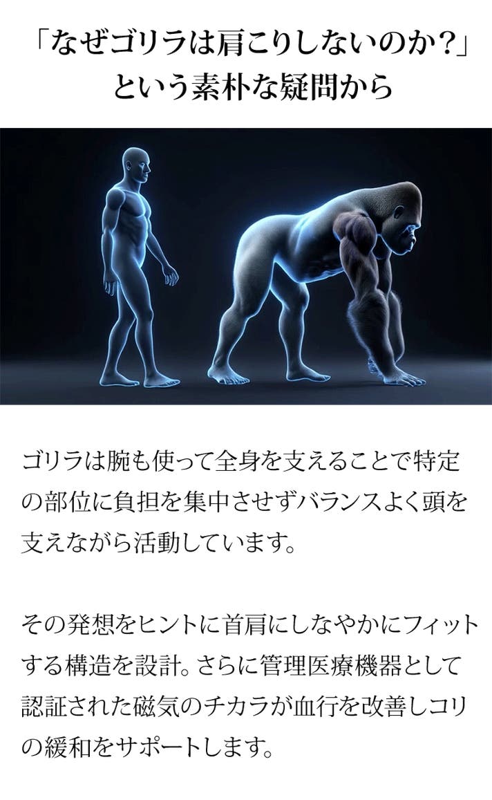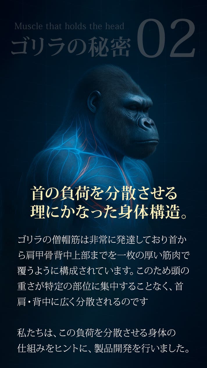 強く、優しく。ゴリラの僧帽筋を思わせる安心のホールド感であなたの首肩を包み込むようにフィット。