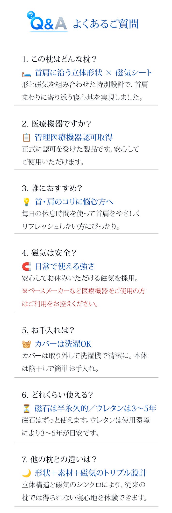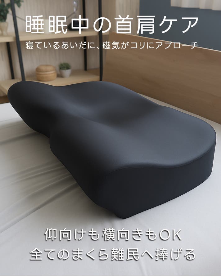・定期的に風通しの良い日陰で陰干ししてください。・枕本体は洗えません、絶対に洗わないでください。・カバーは取り外して洗濯が可能です。洗濯表示に従いお手入れください。・内側に内蔵された磁気ユニット(内袋)は取り外さないでください。無理に外すと磁石の位置がずれたり、性能に影響を及ぼす恐れがあります。