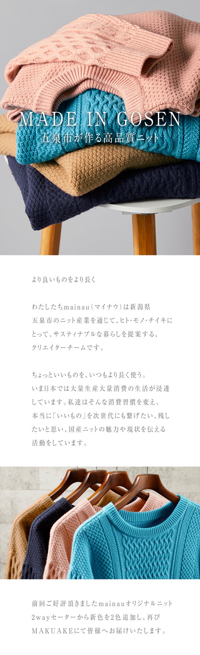 「Makuake(マクアケ)」は、実行者の想いを応援購入によって実現するアタラシイものやサービスのプラットフォームです。このページは、 ファッションカテゴリの 「気分で変える!着こなしの幅が広がる!前後がない国産2WAYセーター」プロジェクト詳細ページです。