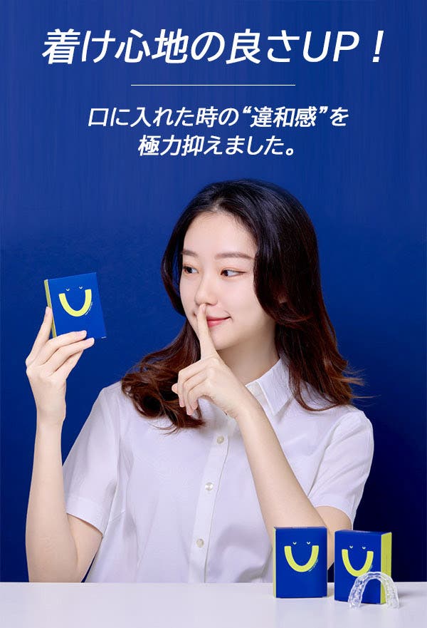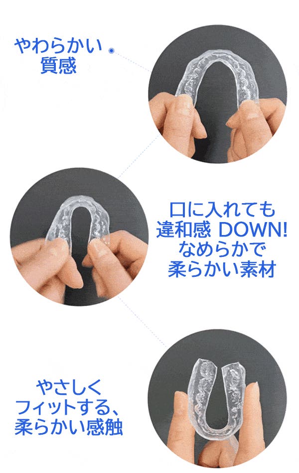 一晩中楽な着け心地!歯茎に当たる部分は柔らかく、装着中の違和感を感じにくいです。歯の形状に沿った自然な曲線で、異物感を限りなくゼロに。人間工学的デザインで違和感を最小限に抑え、耐久性を強化。