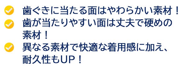 - 歯ぐきにやさしいソフトな素材と、歯の力に負けない丈夫な素材のダブル構造で快適な睡眠をサポート。