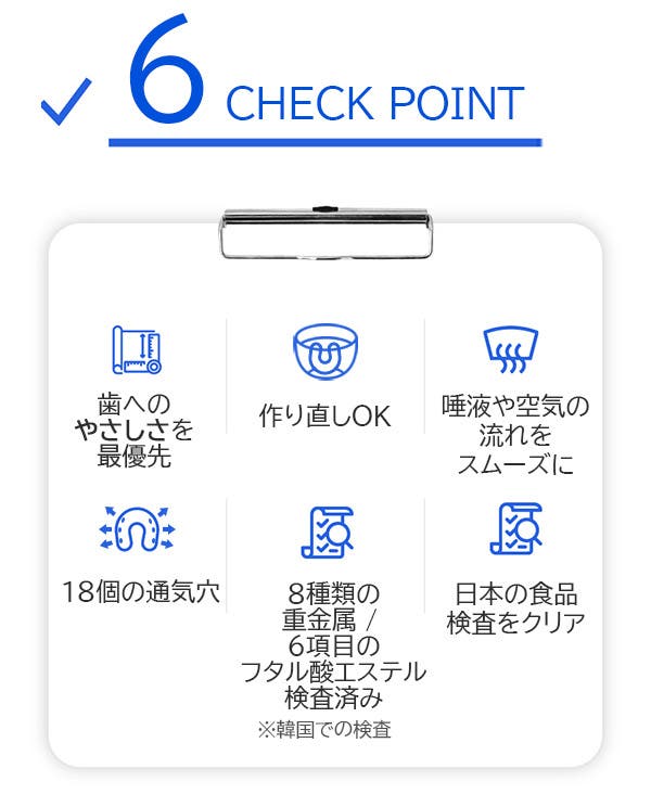 圧迫感を抑えた薄くやわらかな設計、空気や唾液の流れを妨げない18個の側面通気孔、そして長期間使用に耐える素材選び──そのすべては、お客様の声に耳を傾け、一つ一つ改良を重ねた結果です。