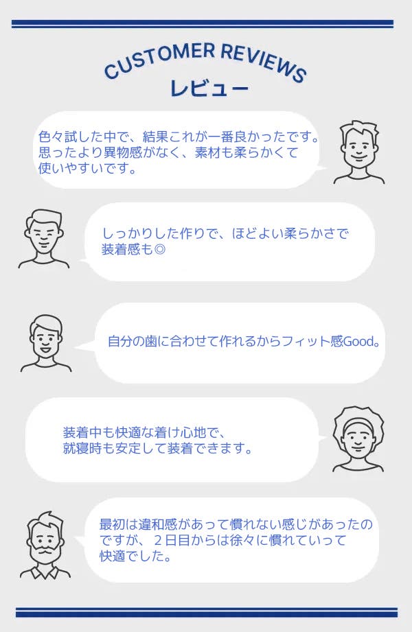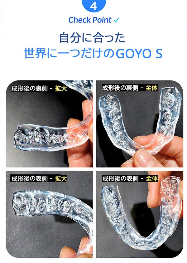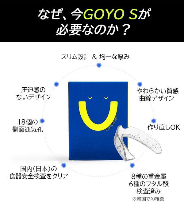 意匠登録・商標登録済みのGOYO S! 睡眠時の快適さを追求し、細部までこだわって設計された高品質のナイトガードです。おやすみ中もつけられるやさしいフィット感と、長く使える丈夫さを両立。毎晩、口に入れて使用するものだからこそ、生産後は徹底的な品質チェックを行い、検品後に梱包・発送しています。