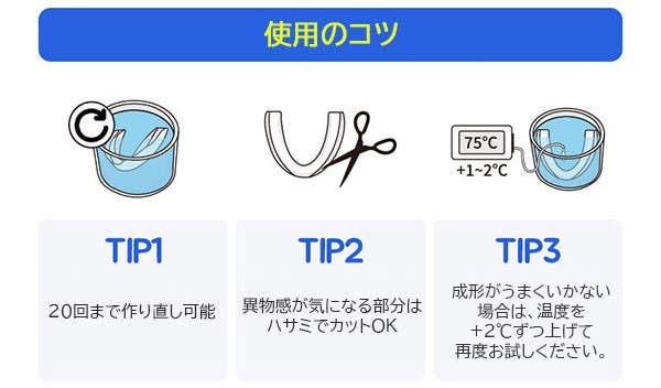 自分の歯に合わせて手軽に成形できます。(およそ20回まで作り直し可能)GOYO Sは作り直しができるため、初めての方でも手軽にお試しいただけます。