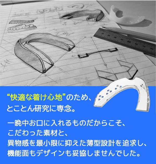 一晩中お口に入れるものだからこそ、厳選した素材と異物感を最小限に抑えた薄型設計を追求し、機能面もデザインも妥協しませんでした。