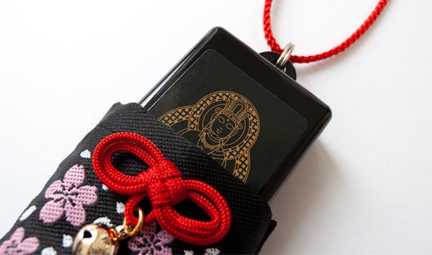袋部分は、きめ細かな風合いが特徴の「越前織」で、一つ一つ丁寧に作り上げました。また、裏面には社名にちなんだオリジナル神社名を入れさせていただき、一見、電子機器とわからないような見た目もポイントです。