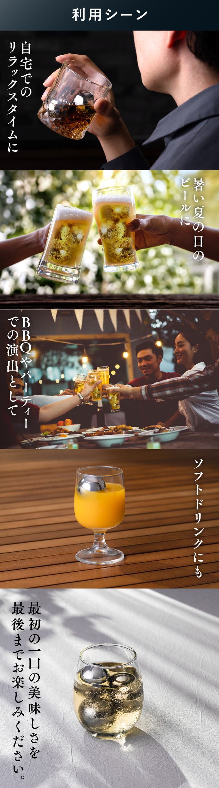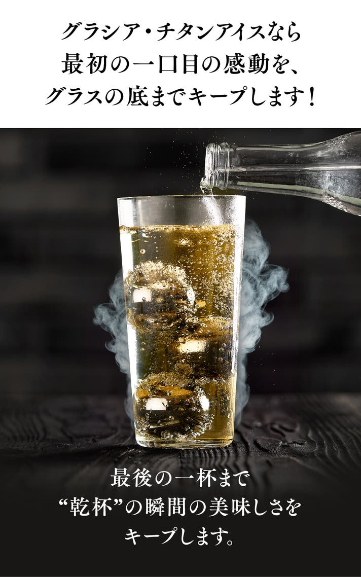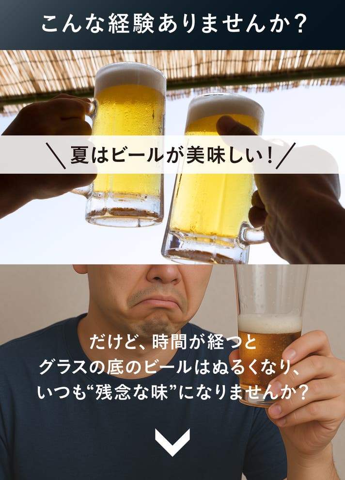 - 氷のように溶けないから、味を薄めずに冷たさをキープ。ビールの一口目のうまさが、最後まで続く。
