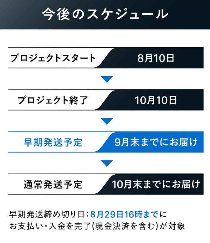 8月29日16時までにお支払い・入金を完了(現金決済を含む)が対象となります。 それ以降にお支払い完了された方は通常通りプロジェクト終了後の配送となりますので、ご了承ください。