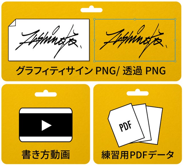 本プロジェクトでは、ご購入いただいたサインを再現できるよう筆記動画及び練習用データをセット内容に追加しております。