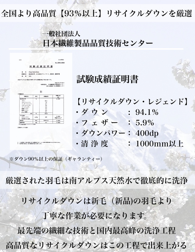 中素材:リサイクルホワイトダウン90%/フェザー10%
