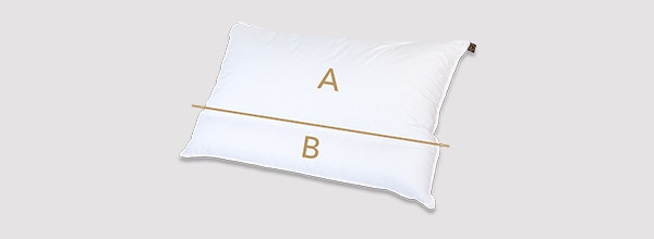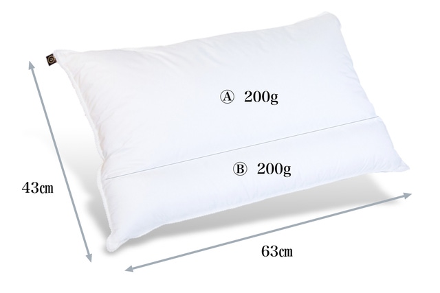枕内部に仕切りを設けて頭部(Ⓐ)と首もと部(Ⓑ)の二つのエリアに分割。それぞれのエリアへの羽毛の充填量を最適化することにより、体圧を頭部の一点に集中させることなく、広い範囲に分散させることに成功しました。