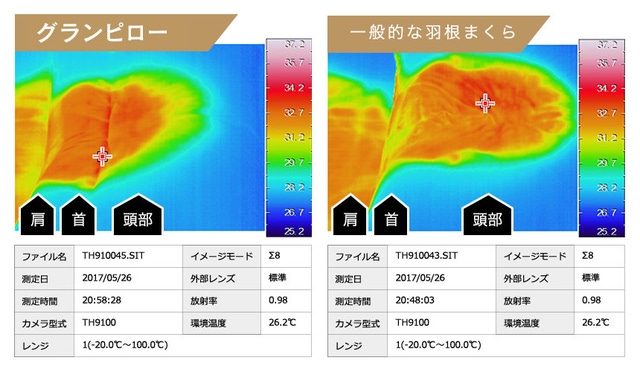 一般的な羽根まくらは頭部全体を温めていますが、グランピローは、頭部を温めず、二分割構造により、首回りから肩にかけて暖めている事がわかります。