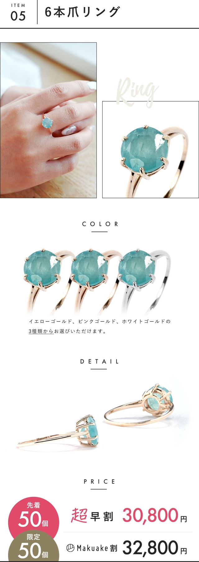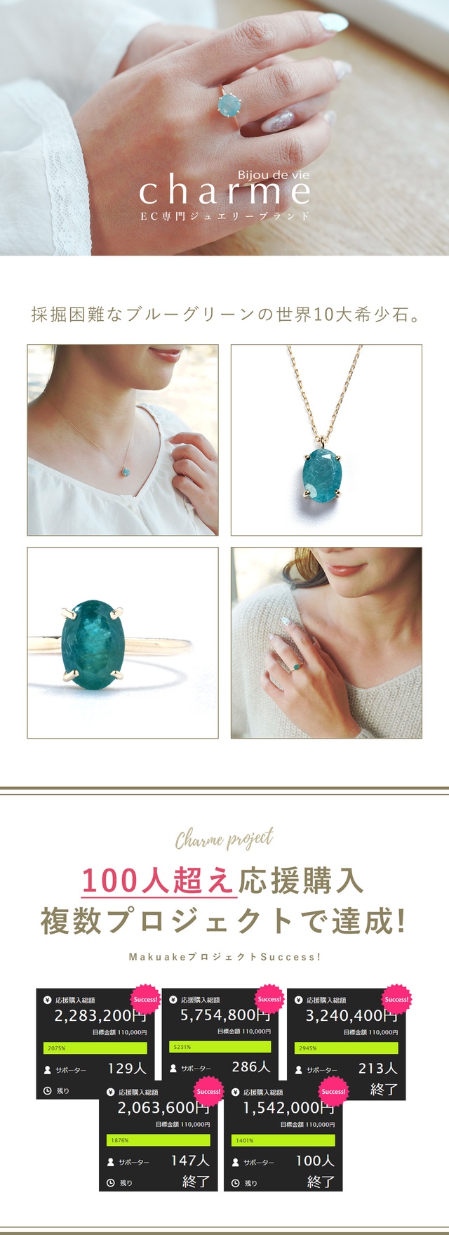 『charme』では、宝石の仕入れ方法やルートの開拓を徹底し、さらに通販限定にすることで中間マージンをカット。レアストーンや10金を使用したジュエリーにもこだわりつつも、お⼿にとっていただきやすい価格を実現できたと⾃負しております。