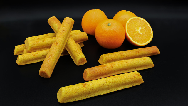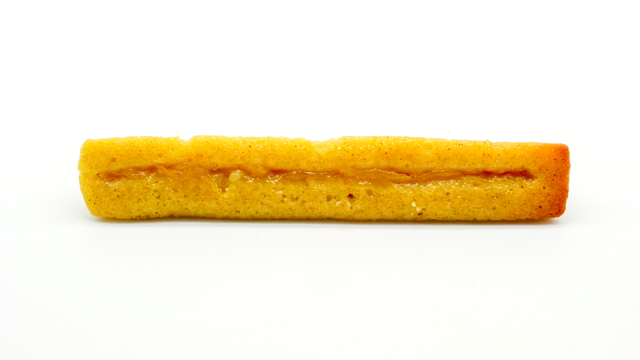 村上トラネーブルをたっぷり使ったスティック フィナンシェ。焦した発酵バターを使用しています。生地には村上トラネーブルの果汁と擦りおろした果皮をたっぷり加えることで、噛めば噛むほど生地の旨味とほどよい酸味が広がります。フィナンシェの底側には村上トラネーブルのソースをしぼり焼き上げました。ねっちりやわらかな食感の生地の表面に散りばめたネーブルピールのほのかな苦味と食感がアクセント。ネーブルの果肉だけでなく果皮まで使用できるのは、たではら農園の丁寧な栽培のおかげです。フィナンシェに仕上げた村上トラネーブルを丸ごとご堪能ください。