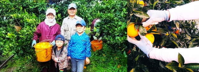 ピーク時は1日に2,000kgほどの果実をご家族やご親族と収穫するたではら農園。収穫時には、お孫さん達も手助けしてくれるそうです。「急斜面での重い果実の収穫は若い人でも大変ですが、畑からは海が見えて景色もよく、休憩の時は皆とおしゃべりをするのが楽しい」と代表の蓼原由美子さん(写真左)は笑顔で語ります。