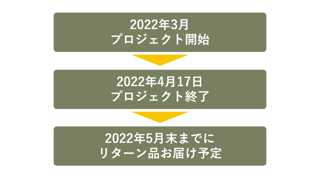 4月17日(日)までプロジェクト実施→4月下旬〜リターン品製造→順次リターン品をお届けいたします(5月末までにお届け完了予定)。リターン品のご到着までいましばらく、楽しみにお待ちください。