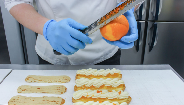 「グラン スイート サーカス」のケーキ エクレアやフィナンシェには村上トラネーブルの風味をより高めるためにネーブルの果皮を隠し味に散りばめています。果皮まで丸ごと味わえるのは、たではら農園の丁寧で健康的な栽培のおかげなんですよ。