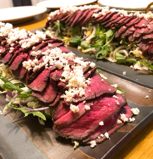 冷蔵庫で解凍して、お好みの厚さに切り分けてお召し上がりください。サラダや温めてローストビーフ丼にしてもおいしいです。