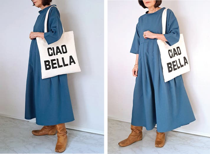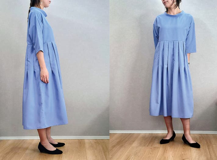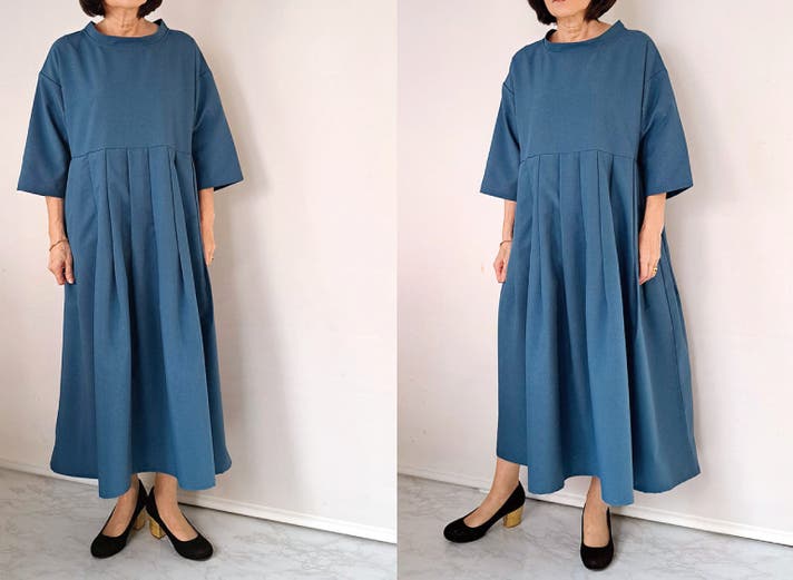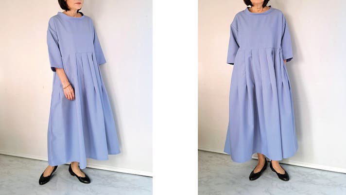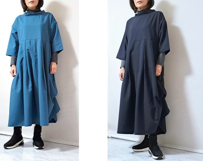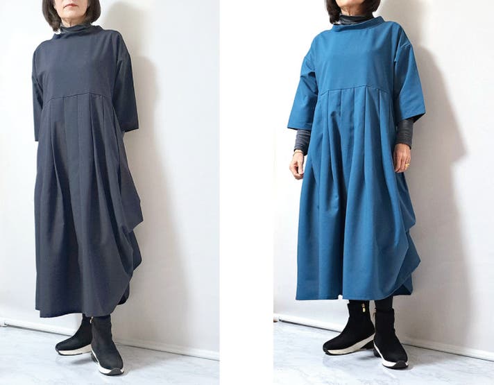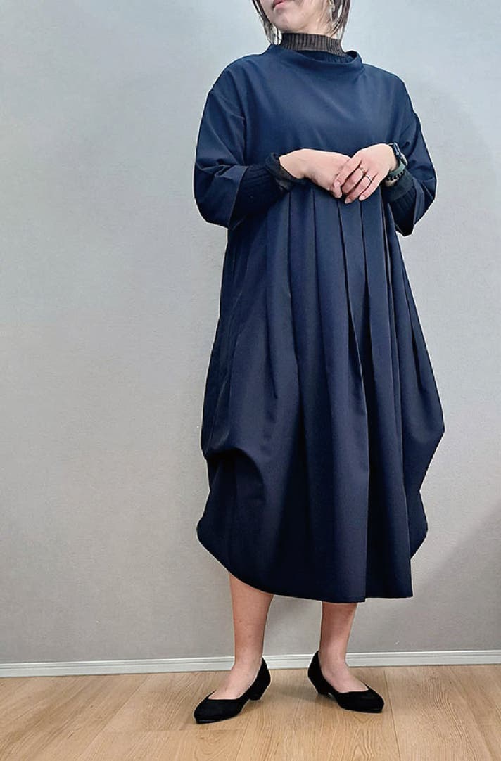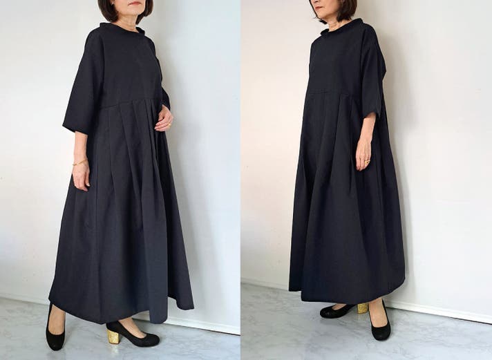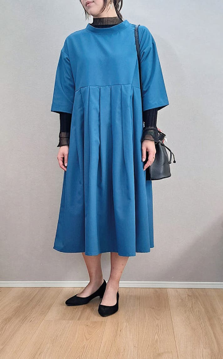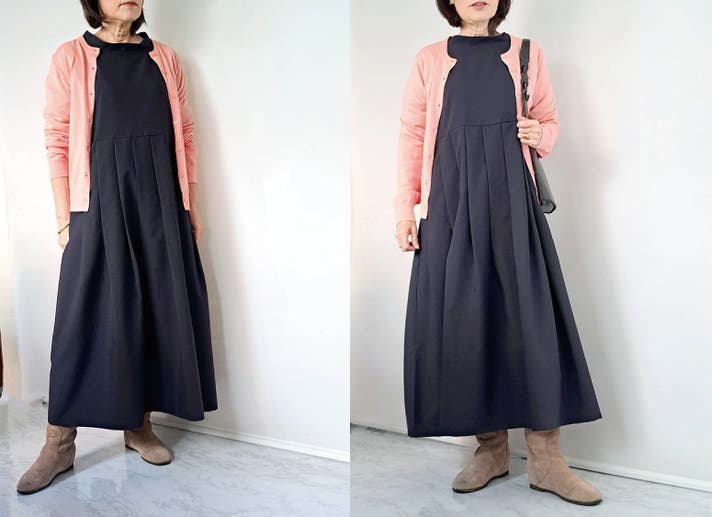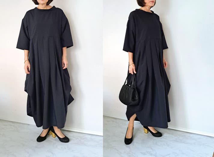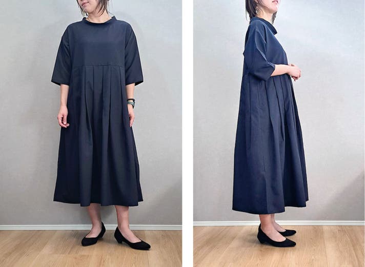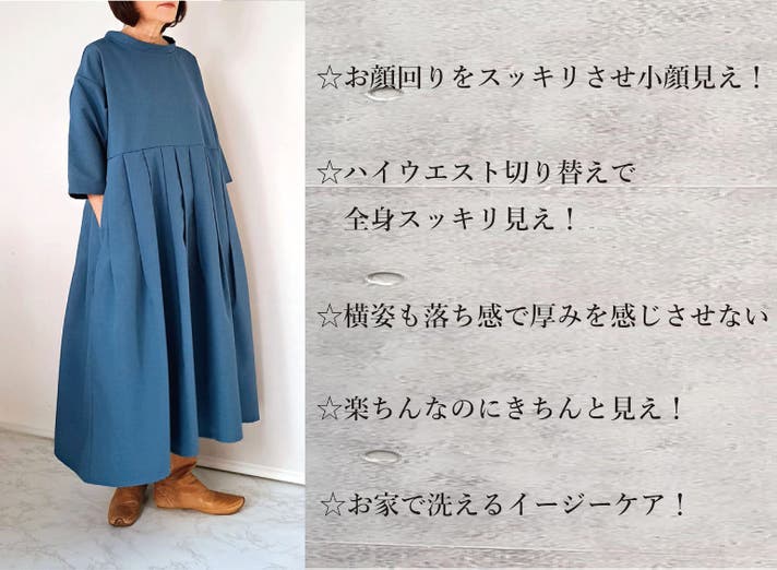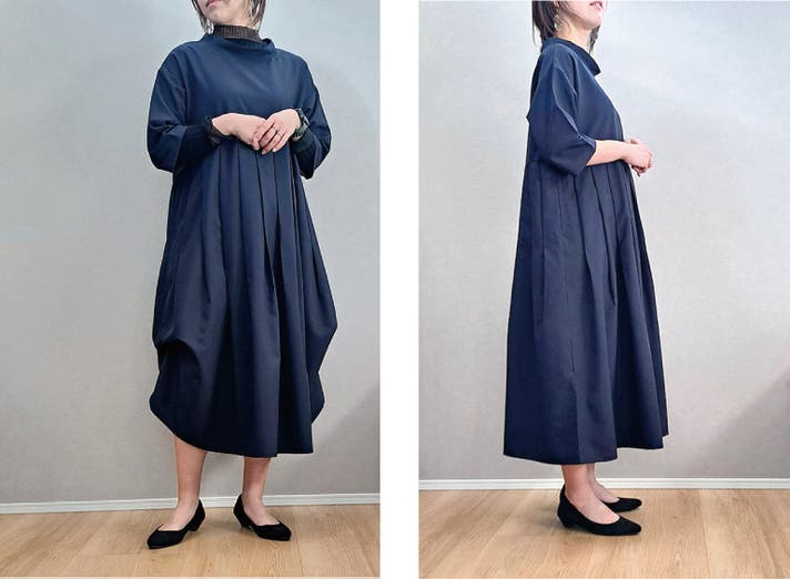 このワンピースは身体の線を拾わないのにお顔まわりと全体の印象を上品にみせてくれる大人のための1枚です!